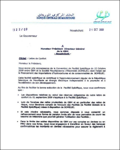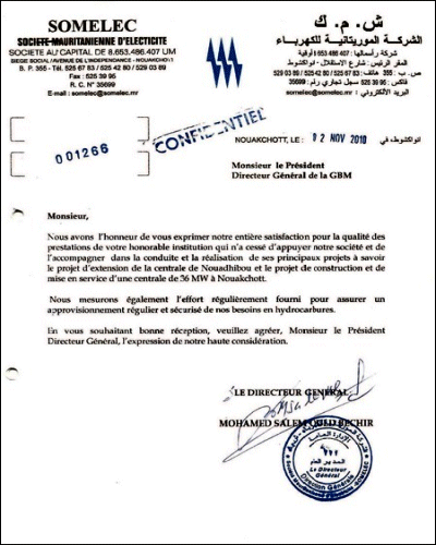 La GBM a soutenu seule la Somelec à une époque où celle-ci était en difficulté. A-t-elle oublié que c’est la GBM qui l’a sortie des graves difficultés de la centrale de Nouadhibou (son Directeur Général a même adressé à la GBM une lettre de remerciement « confidentielle » (voir annexe 3)), la GBM qui a permis le financement de la centrale de 36MW (Empower) grâce à une facilité de 48 millions de dollars US, la GBM qui lui a financé les importations de pétrole pour un montant global de l’ordre de 150 millions de dollars US au cours des trois dernières années ? Le Gouverneur actuel de la Banque Centrale a personnellement signé l’engagement irrévocable de la BCM de couvrir la GBM pour les devises nécessaires au règlement des importations de Somelec (voir annexe