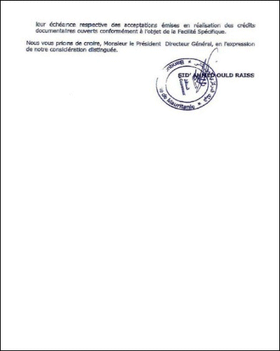 Par conséquent, je conseille à ceux envers qui j’ai des engagements inférieurs à 10 millions d’ouguiyas (2) et aux Organisations Internationales clientes de la banque ainsi qu’au Représentant du FMI à Nouakchott de s’adresser à notre avocat, Maître Yezid (3) pour en disposer.