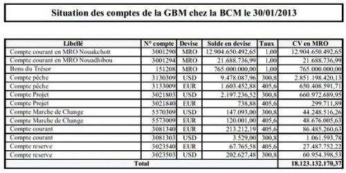 Depuis quelques semaines, en effet, la BCM a décidé, en contradiction avec ses propres textes, de priver la GBM de l’accès aux devises, des dépôts des entreprises publiques et parapubliques, d’une participation normale au jeu de la compensation, de la gestion de ses propres comptes, etc. Au moment où Monsieur le Gouverneur de la BCM et certains membres du Gouvernement ont donné instruction aux entreprises, publiques et privées, tant mauritaniennes qu’étrangères, de retirer leurs dépôts de la GBM, les comptes courants de cette dernière à la Banque Centrale étaient créditeurs de 12.904.650.492,65 ouguiyas (auxquels s’ajoutent 765 000 000 ouguiyas de Bons du Trésor), de 9.478.087,96 dollars US (auxquels s’ajoutent 2 197 000 dollars US de comptes de projets) et de 1.603.452,88 euros, soit un total général de 18 milliards 123 millions d’ouguiyas1(voir relevés de compte en annexes 1 & 2). Ces comptes ont été virtuellement séquestrés par Monsieur le Gouverneur de la BCM (depuis août 2012 pour les dollars US !). Il s’agit, pour le pouvoir, de briser la dynamique du Groupe Bouamatou (BSA) et de faire main basse sur le patrimoine de la banque au profit d’intérêts privés clairement identifiés, au détriment de ma personne, certes, mais aussi et surtout au détriment de l’Economie Nationale et des clients de la banque. A noter que la GBM a tenu informé le Représentant Résident du FMI en Mauritanie à chaque étape des agissements des autorités à l’encontre de la banque.