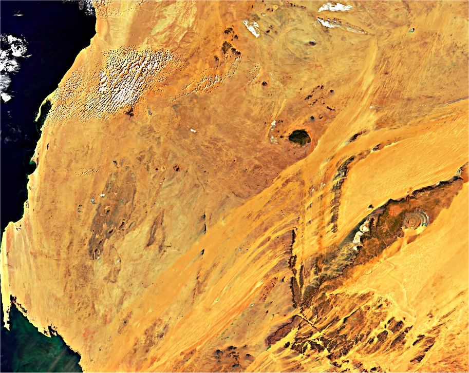 En vedette sur cette image prise par Envisat, deux phénomènes géologiques spectaculaires - « l’Œil de l’Afrique » (à droite) et une montagne magnétique (au centre) - dans le désert du Sahara, en Mauritanie, au nord-ouest de l’Afrique.
